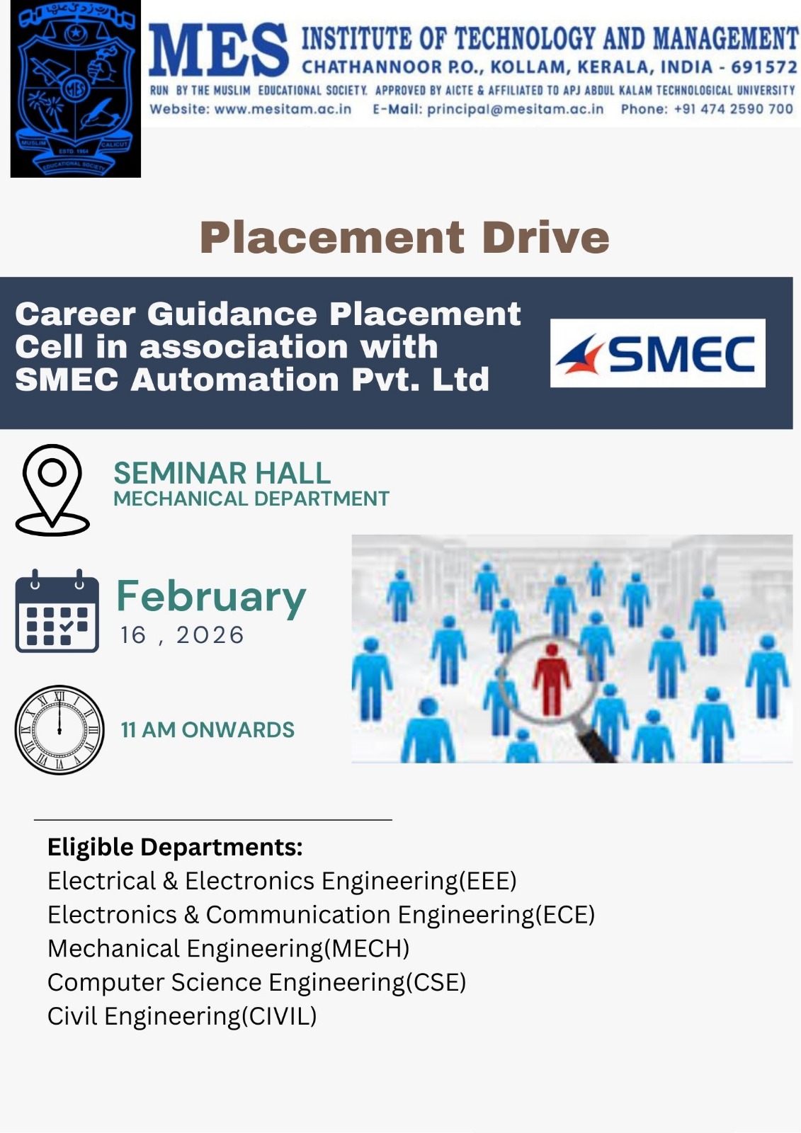 The Civil Engineering Association of MES Institute of Technology and Management (MESITAM), Chathannoor is organizing a Technical Talk Session on Site Supervisory Skills and Construction Drawings by Er. Sanal Satheesh on 5th March 2025 at 10:30 AM in the EEE Seminar Hall.