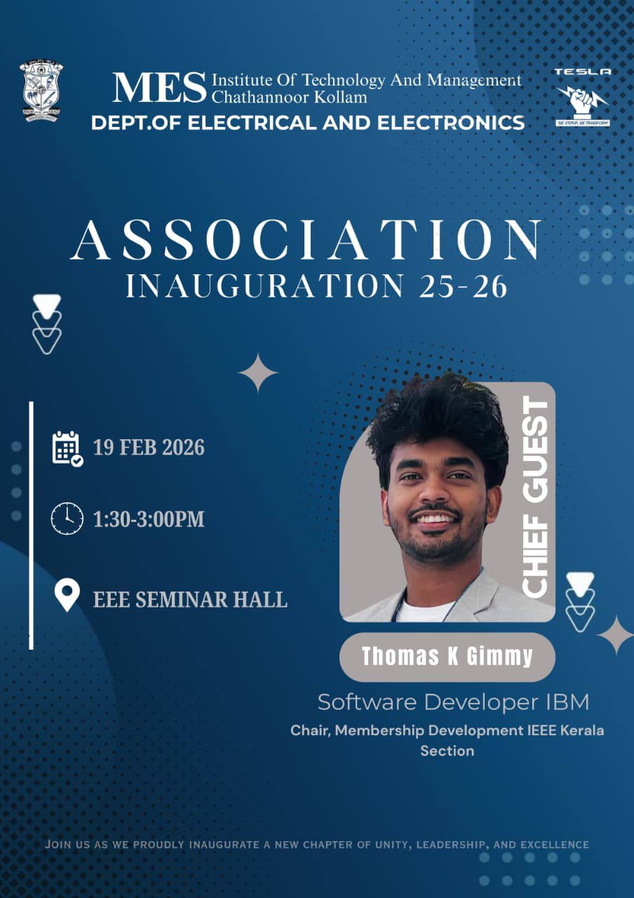 The Department of Electrical and Electronics Engineering, MES Institute of Technology and Management, Chathannoor, proudly presents the Association Inauguration 2025 - 26.