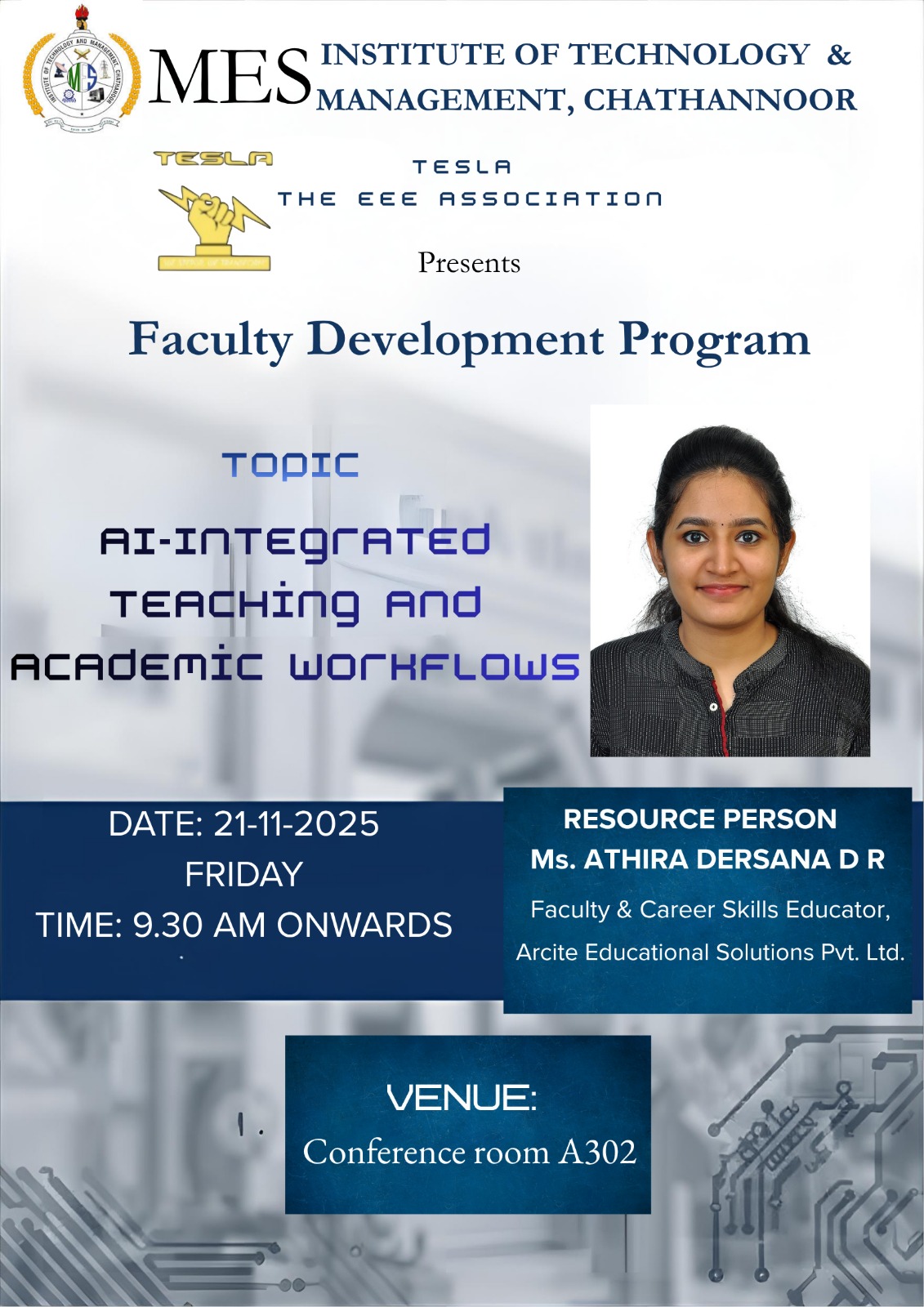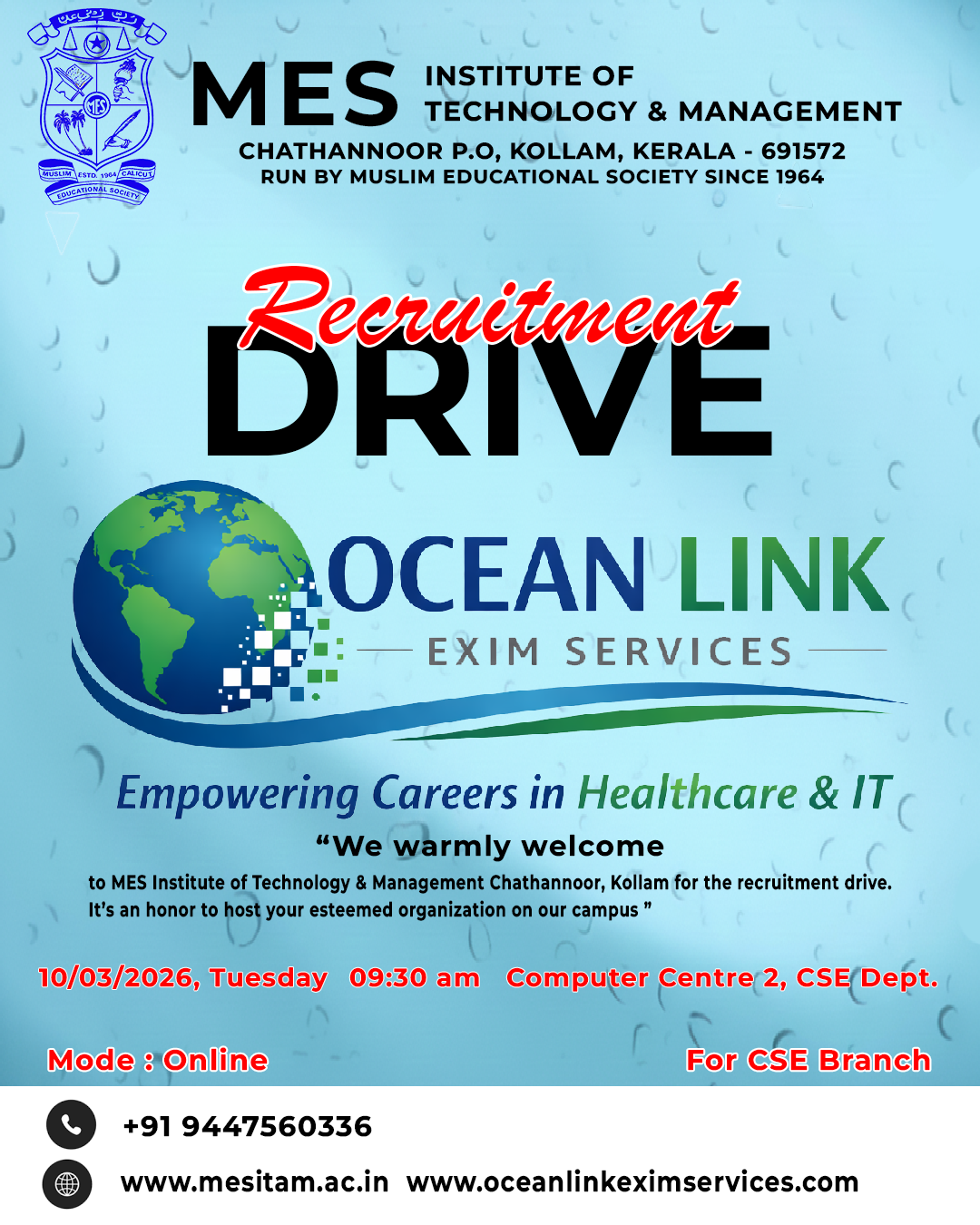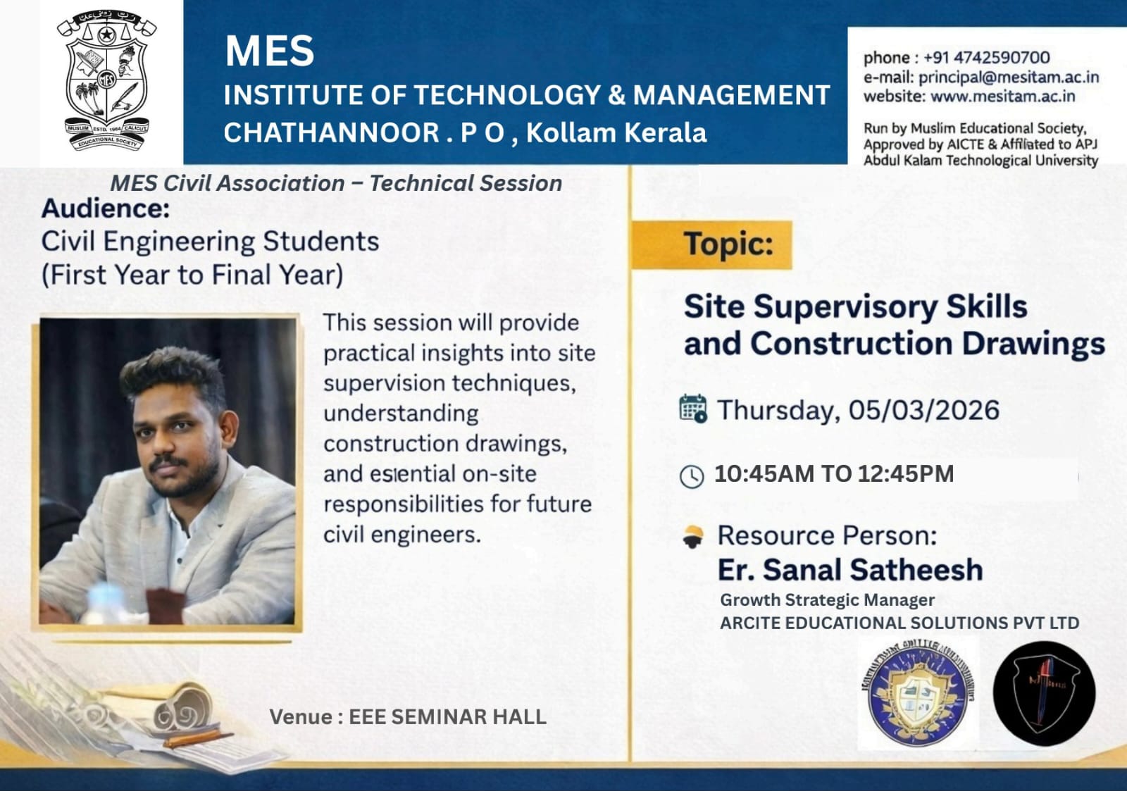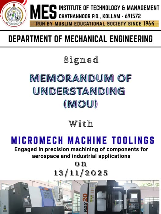 Read moreThe Department of Mechanical Engineering at MES Institute of Technology & Management has signed a Memorandum of Understanding (MOU) with MICROMECH MACHINE TOOLINGS on 13/11/2025. This collaboration will focus on precisi...